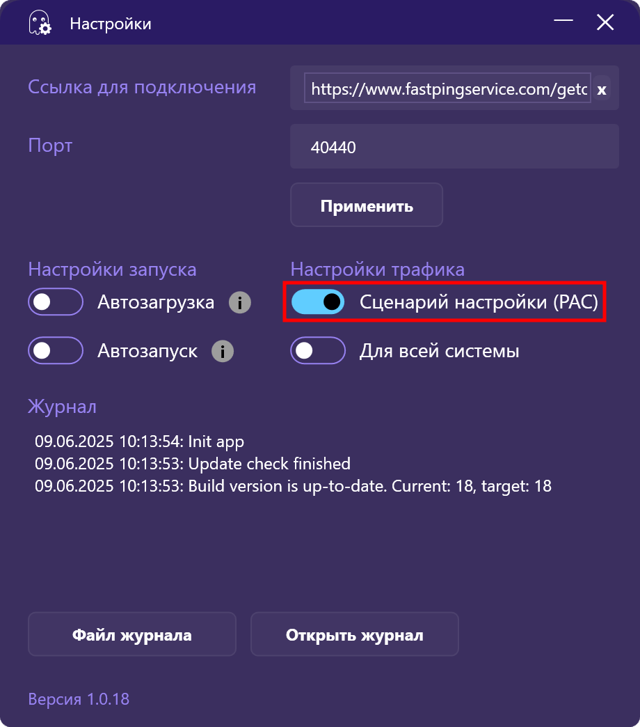 Для работы с терминалами, которые не имеют собственных встроенных  настроек прокси, включите параметр Сценарий настройки (PAC) в окне настроек приложения fastpingservice. Затем произведите подключение, выбрав в контекстном меню пункт Подключить.