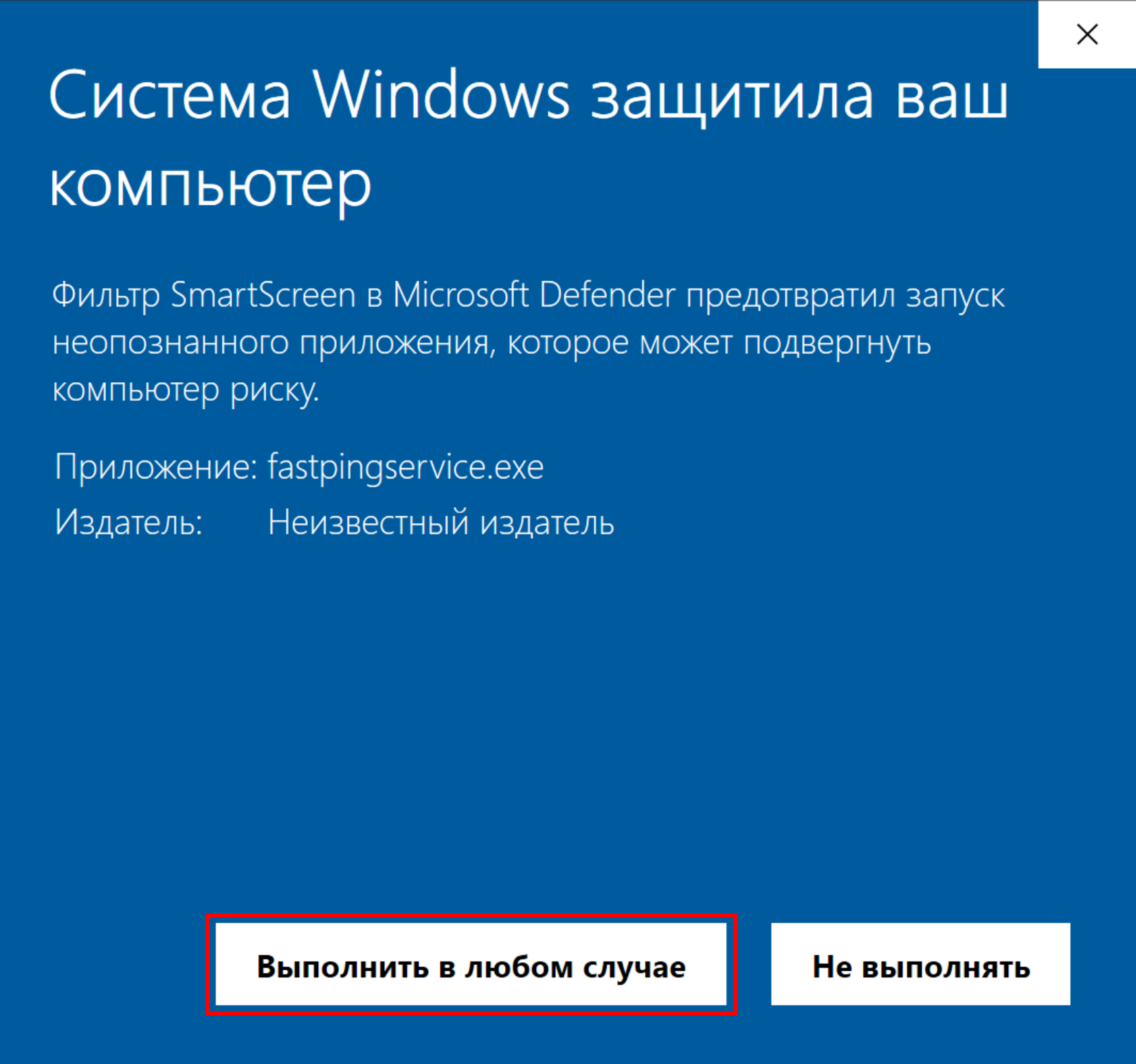 Запустите файл fastpingservice.exe, иконка запущенного приложения появится в трее. Если включен Защитник Windows, то при первом запуске приложения появится сообщение фильтра SmartScreen. Нажмите Подробнее, затем Выполнить в любом случае. В будущем это окно появляться не будет.