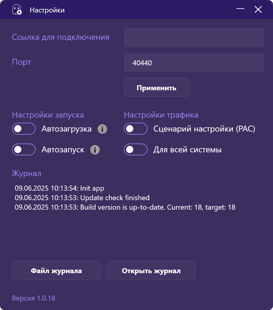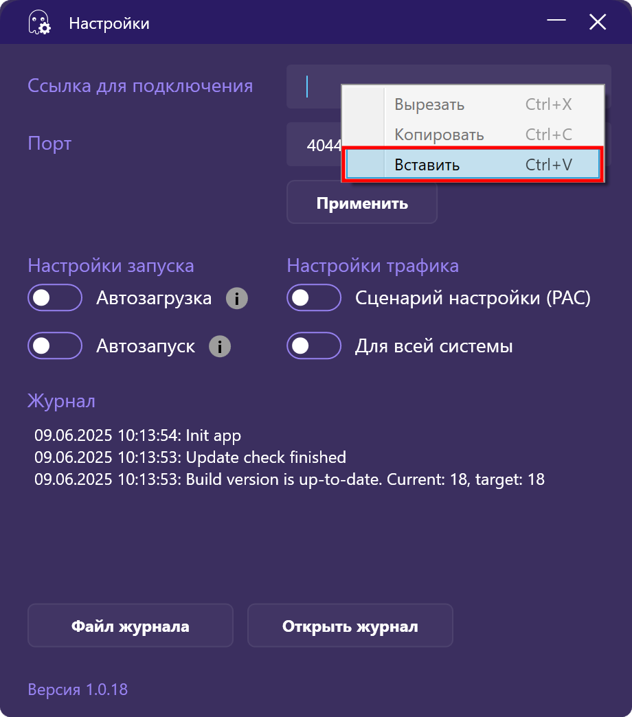 Перейдите в Личный кабинет на веб-сайте Сервиса и выберите необходимый маршрут. Скопируйте ссылку для подключения. Вернитесь в настройки приложения и вставьте скопированную ссылку в поле Ссылка для подключения. Нажмите Применить, настройки сохранятся. Окно настроек приложения можно свернуть или закрыть.