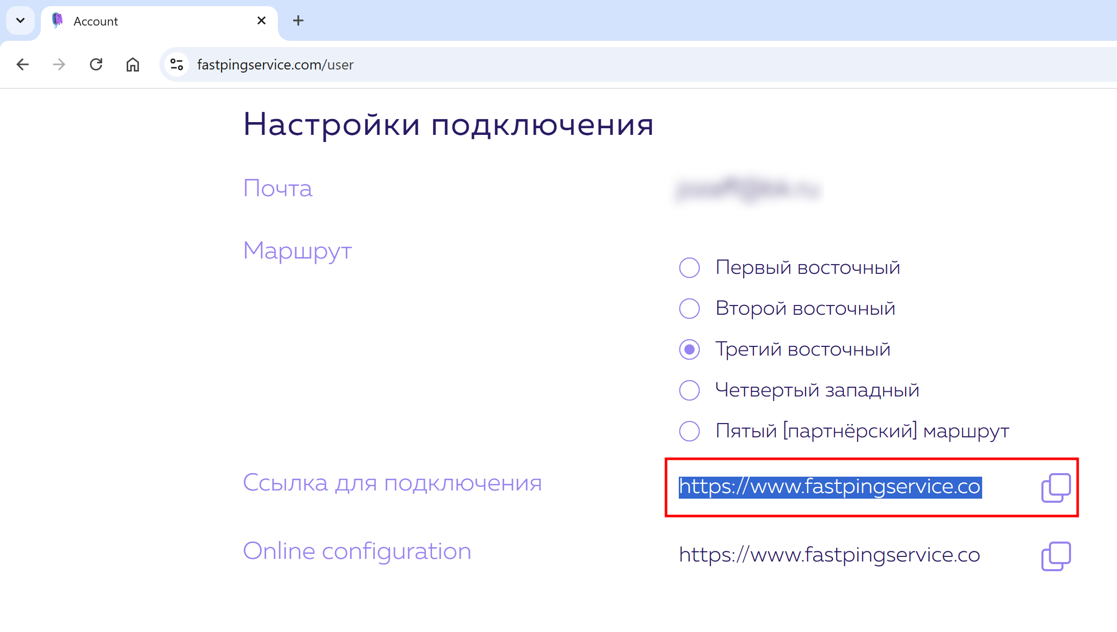 Копировать повторно Ссылку для подключения из Личного кабинета при переключении между Восточными маршрутами не требуется, однако, при переключении с любого Восточного на любой Западный маршрут и обратно — необходимо. Восточные маршруты ссылаются на домен в зоне .COM, а западные — на домен в зоне .EU