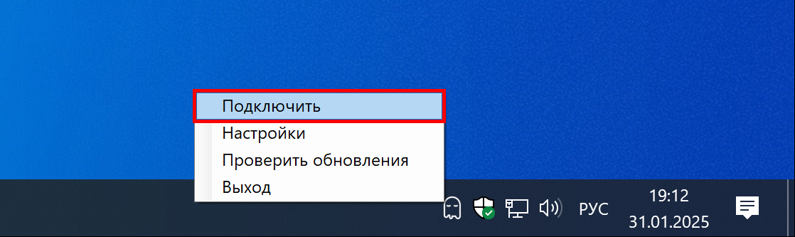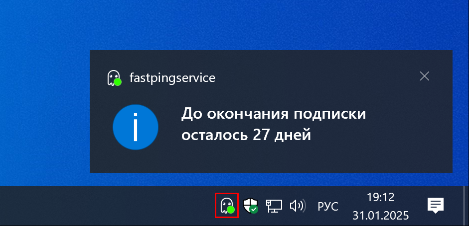 Произведите подключение, выбрав в контекстном меню пункт Подключить. В случае успешного подключения, на иконке приложения в трее появится зеленый индикатор, а в правом нижнем углу экрана — уведомление о сроке окончания вашей подписки.