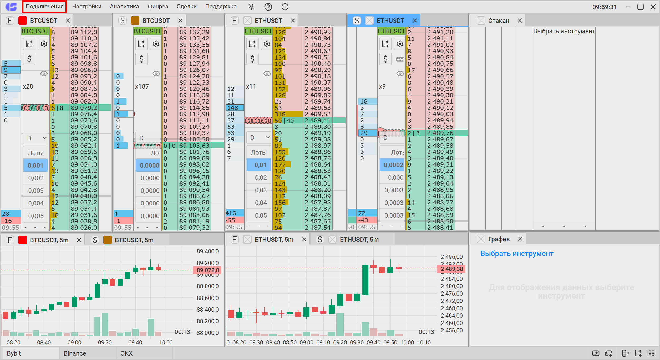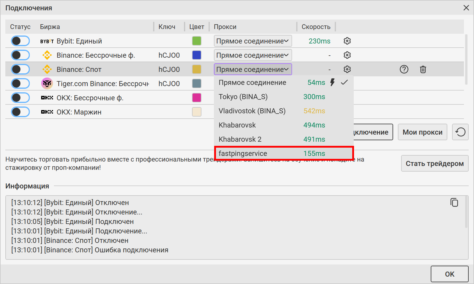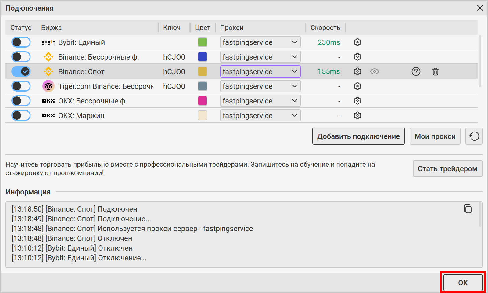 В окне Подключения из выпадающего списка справа выберите созданный вами ранее прокси. Подключение к бирже произойдет автоматически. Нажмите ОК, окно Подключения закроется.