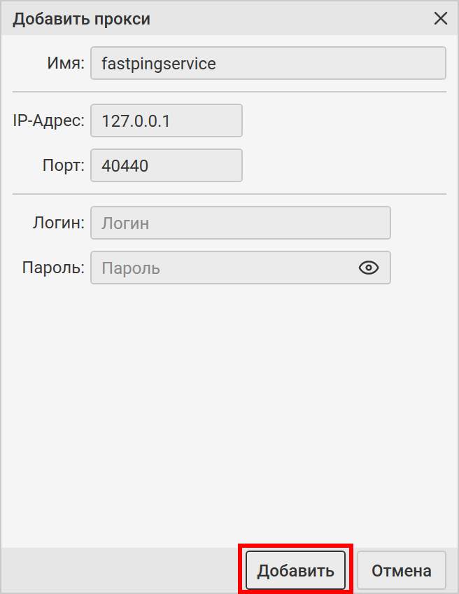 В левом верхнем углу окна терминала нажмите Подключения. В появившемся окне нажмите Мои прокси. В окне создания нового прокси нажмите Добавить прокси. Затем в поле Имя укажите название прокси. Рекомендуем изменить название на fastpingservice или любое другое понятное для вас название.